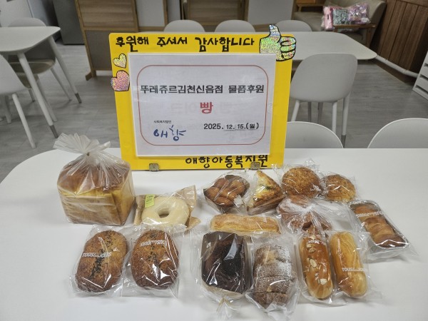 2025. 12. 15 뚜레쥬르김천신음점 물품 후원 페이지 정보 작성자 최고관리자 댓글 댓글 0건 조회Hit 4회 작성일Date 26-01-02 16:10 본문 2025. 12. 15 뚜레쥬르김천신음점 빵 후원 고맙습니다^^ 목록 이전글2025. 12. 16 푸드뱅크 물품 후원 26.01.02 다음글2025. 12. 15 세이브 더 칠드런 물품 지원 26.01.02 댓글 0 댓글목록 등록된 댓글이 없습니다.
