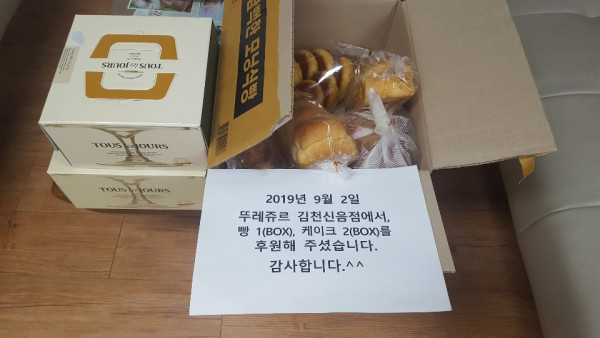 2019. 9. 2 뚜레쥬르 김천 ㄱ신음점에서 빵1박스 후원해 주셨습니다. 고맙습니다.^^