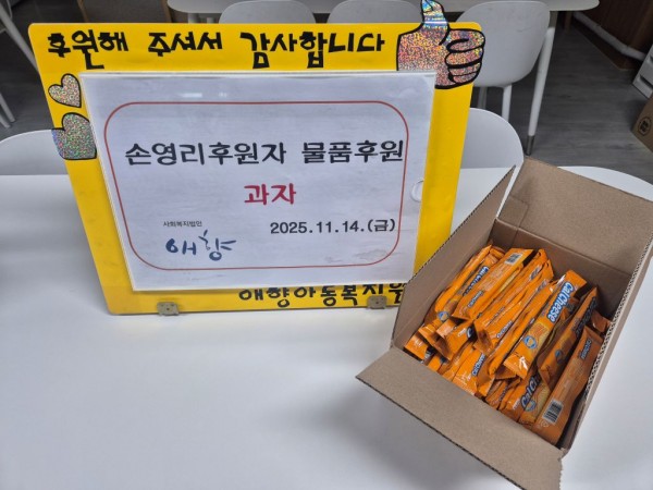 2025. 11. 14 손영리 후원자님 물품 후원 페이지 정보 작성자 최고관리자 댓글 댓글 0건 조회Hit 20회 작성일Date 25-11-18 17:01 본문 2025. 11. 14 손영리 후원자님 과자 후원 고맙습니다^^ 목록 이전글2025. 11. 17 김정아 후원자님 물품 후원 25.11.18 다음글2025. 11. 13 뚜레쥬르김천신음점 물품 후원 25.11.18 댓글 0 댓글목록 등록된 댓글이 없습니다.