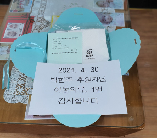 2021. 4. 30 박현주 후원자님 후원 아동의류 1벌 고맙습니다.^^